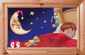Gif Anime Noel Un Enfant Endormi Dans Son Lit Avec Son Nounours La Nuit Est Etoilee Et La Lune En Bonnet De Noel Rit Gif Anime Noel
